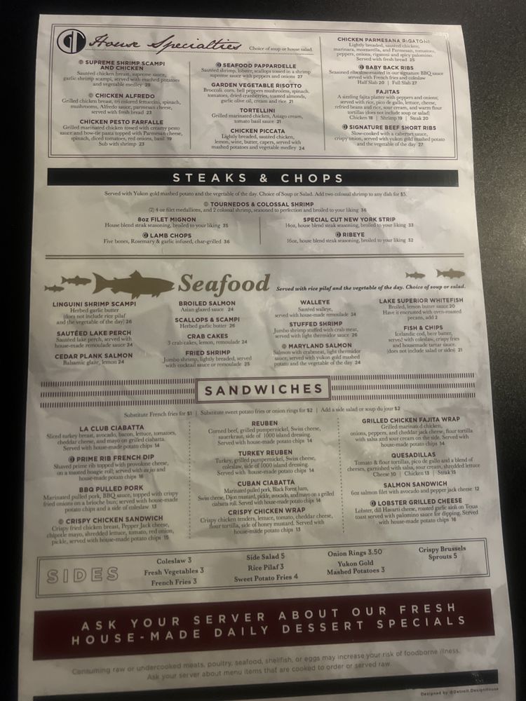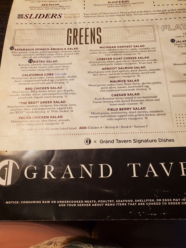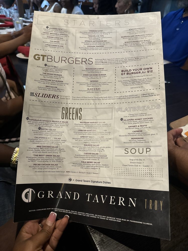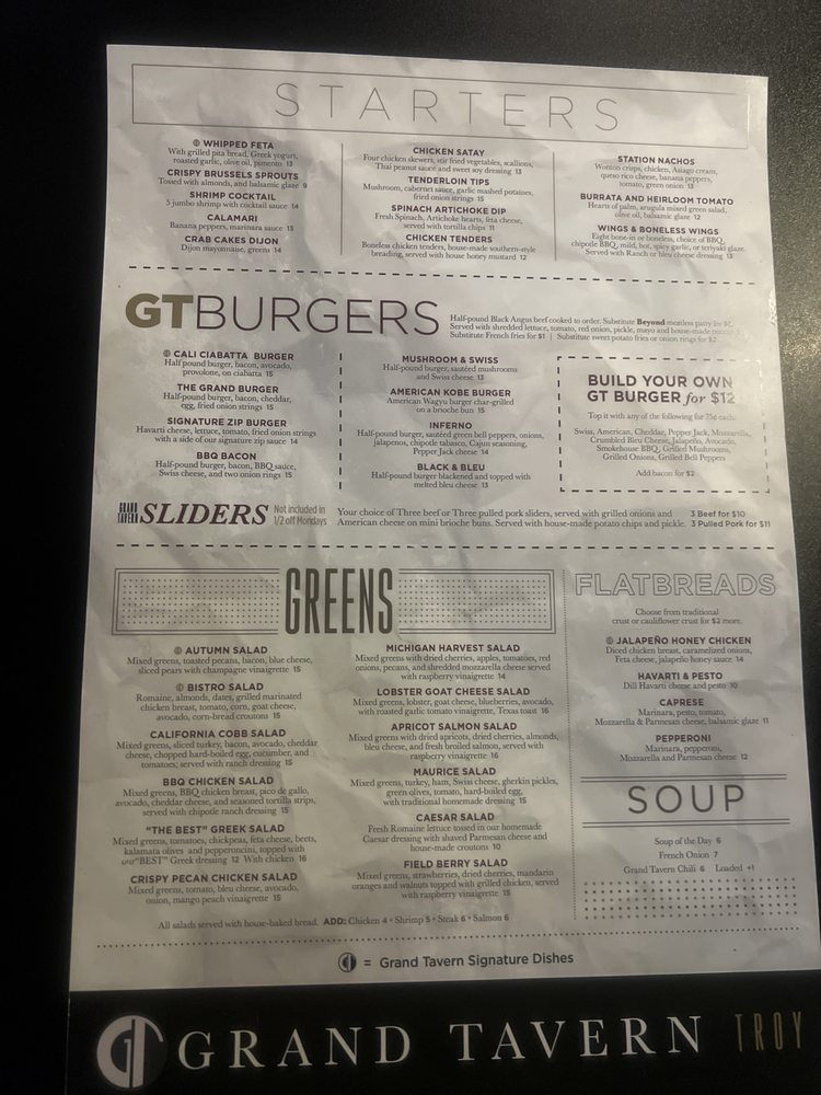 Grand Tavern Troy in Troy, MI, is a go-to spot for New American cuisine and a wide range of bar options. The menu boasts an impressive selection of starters, including the must-try Whipped Feta and Crispy Brussels Sprouts. The Greens section offers unique salads like the Lobster Goat Cheese Salad and the Field Berry Salad. The sandwich options at Grand Tavern Troy are equally enticing, with highlights like the Prime Rib French Dip and the Lobster Grilled Cheese. Customers rave about the pleasant dining experience, prompt service, and delicious food. With a casual ambiance, generous portions, and a great happy hour, Grand Tavern Troy is a must-visit for food enthusiasts looking for a diverse and satisfying menu.